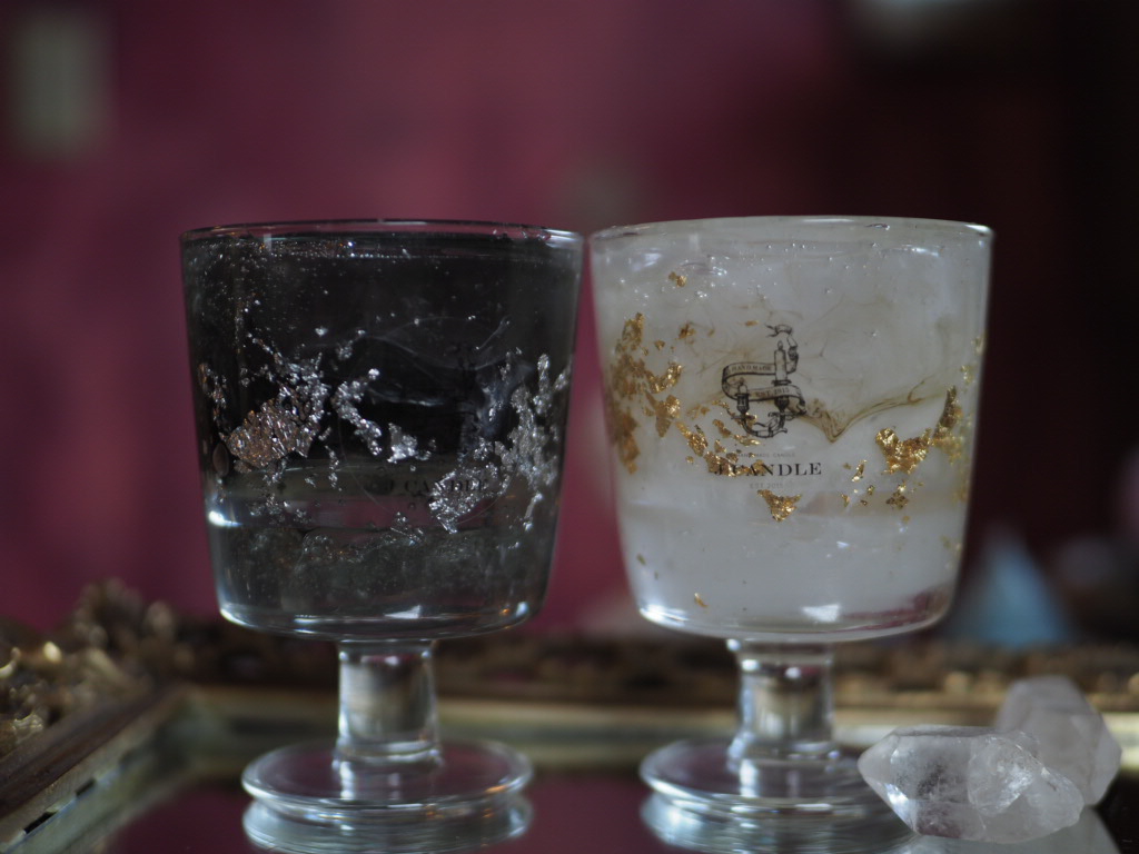 存在感あるゴブレットグラスに、ゴールドorシルバーのホイルフレークを施し、ほんのり色付けたベースカラーに、いくつかのお好きなカラーでマーブルを施し、好みのニュアンスカラーで仕上げて頂きます。好きな香りもつけて頂きます。2層のグラス使用ですので灯し終えた後はキャンドルホルダーとしてもご使用可能です。