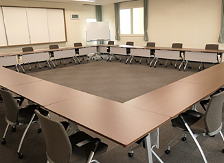 教室配列で最大28名の会議が可能。ホワイトボード・スクリーンを完備しており、会議や研修に最適です。