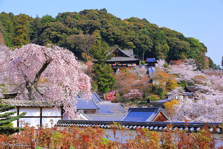 後醍醐天皇の勅願所で、楠正行が四條畷の合戦に出陣の際、辞世の歌を扉に書きつけたことで有名。背後に後醍醐天皇陵がある。