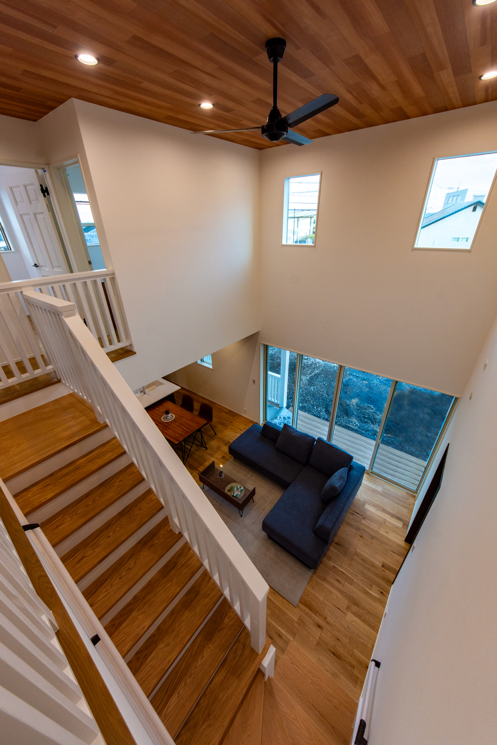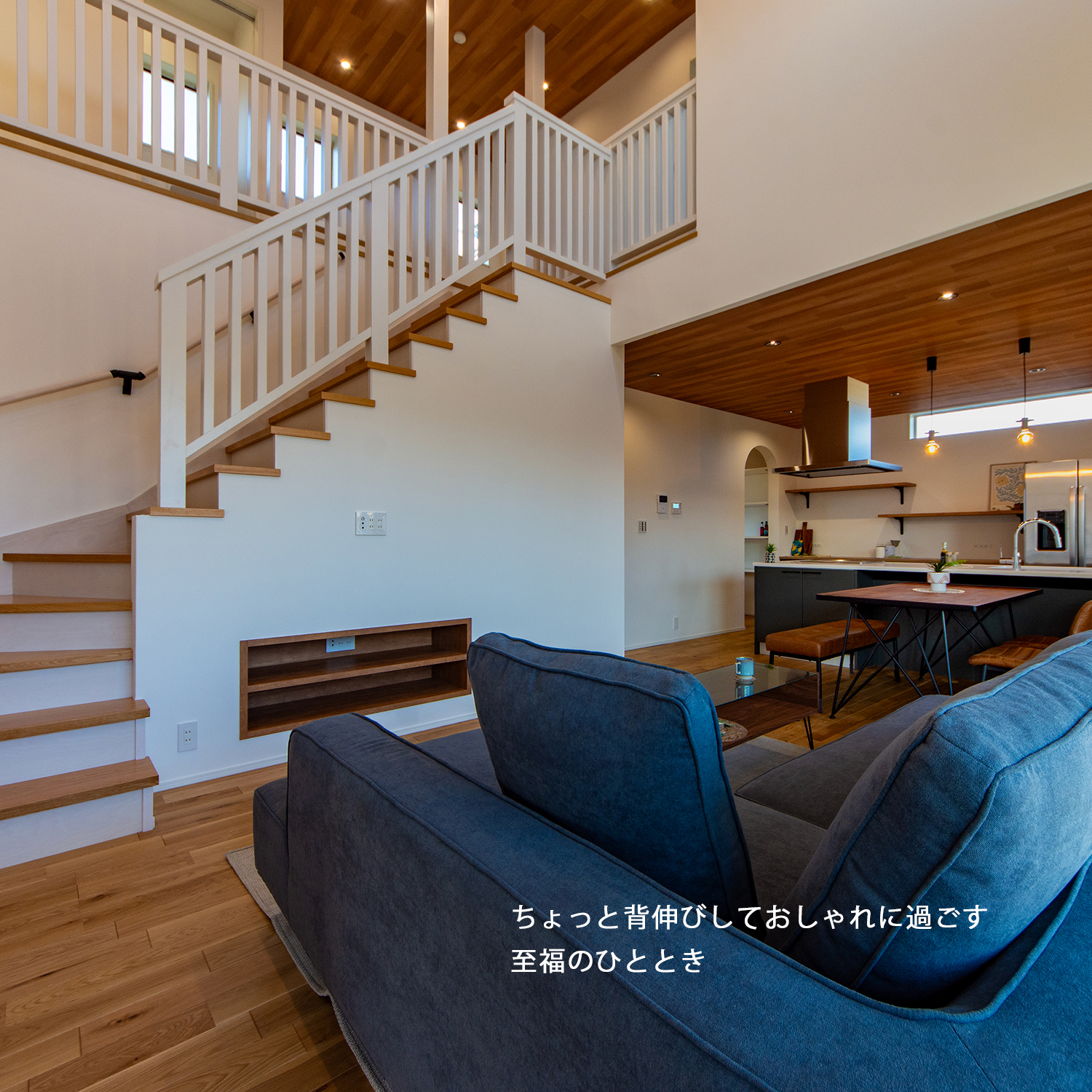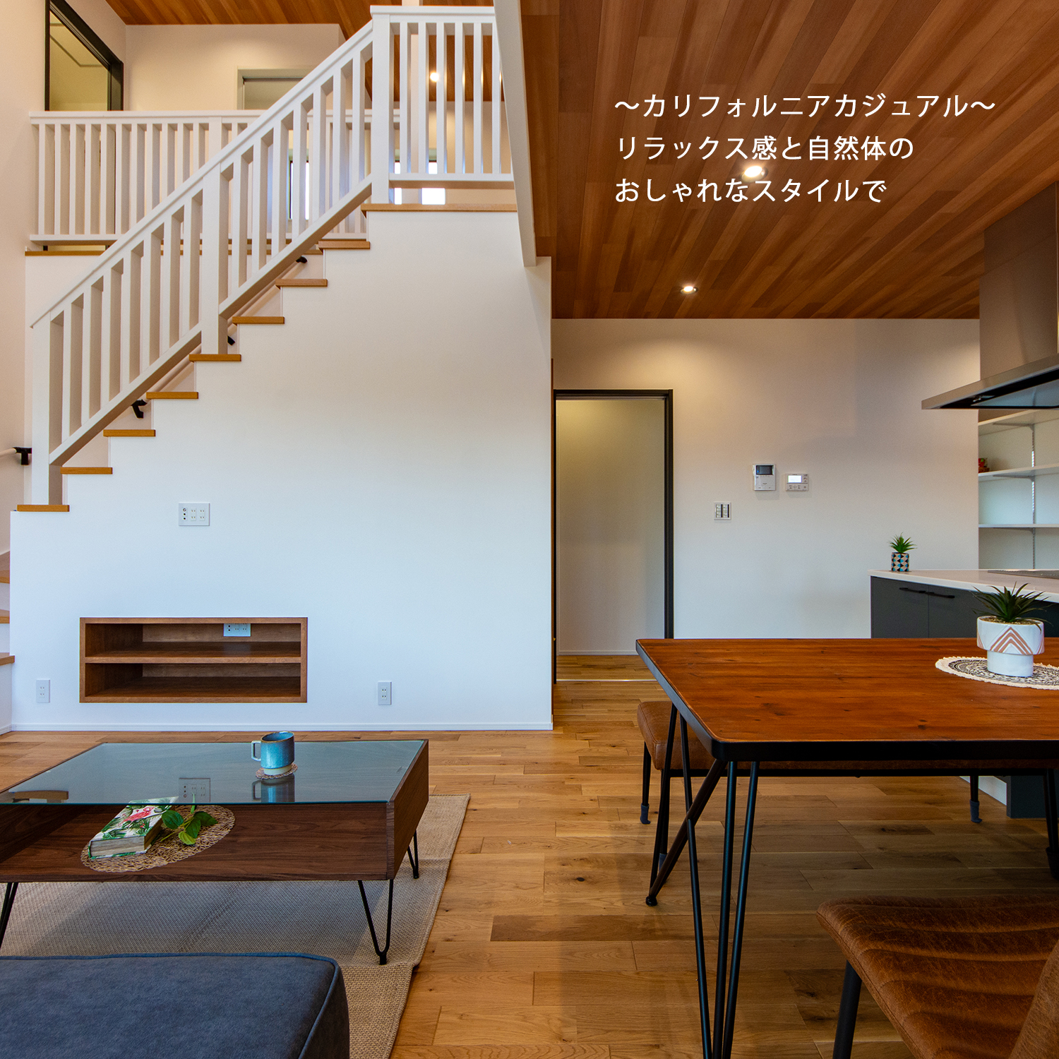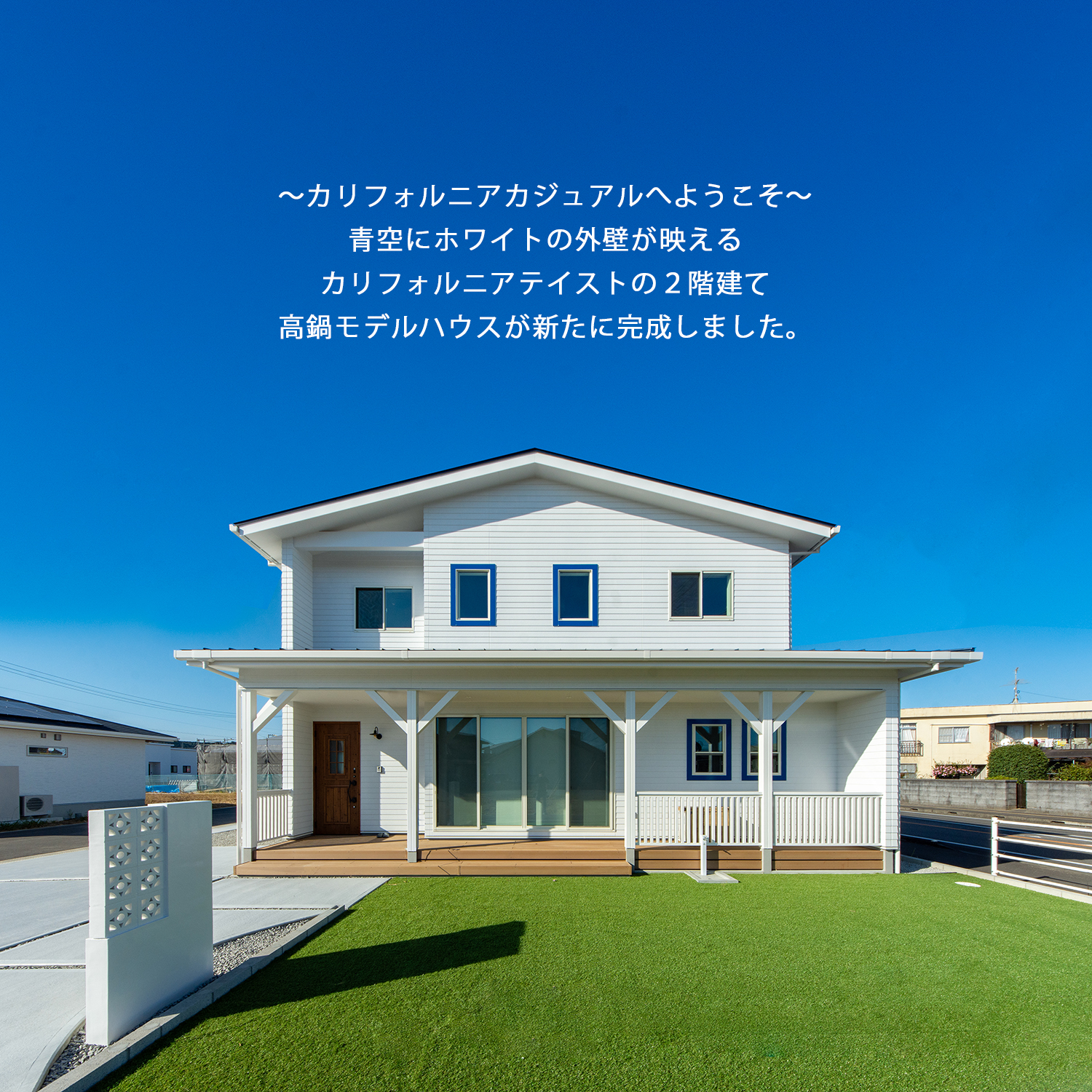 青空にホワイトの外壁が映えるカリフォルニアテイストの2階建て高鍋モデルハウス。吹き抜け空間がとても居心地の良いお家です。