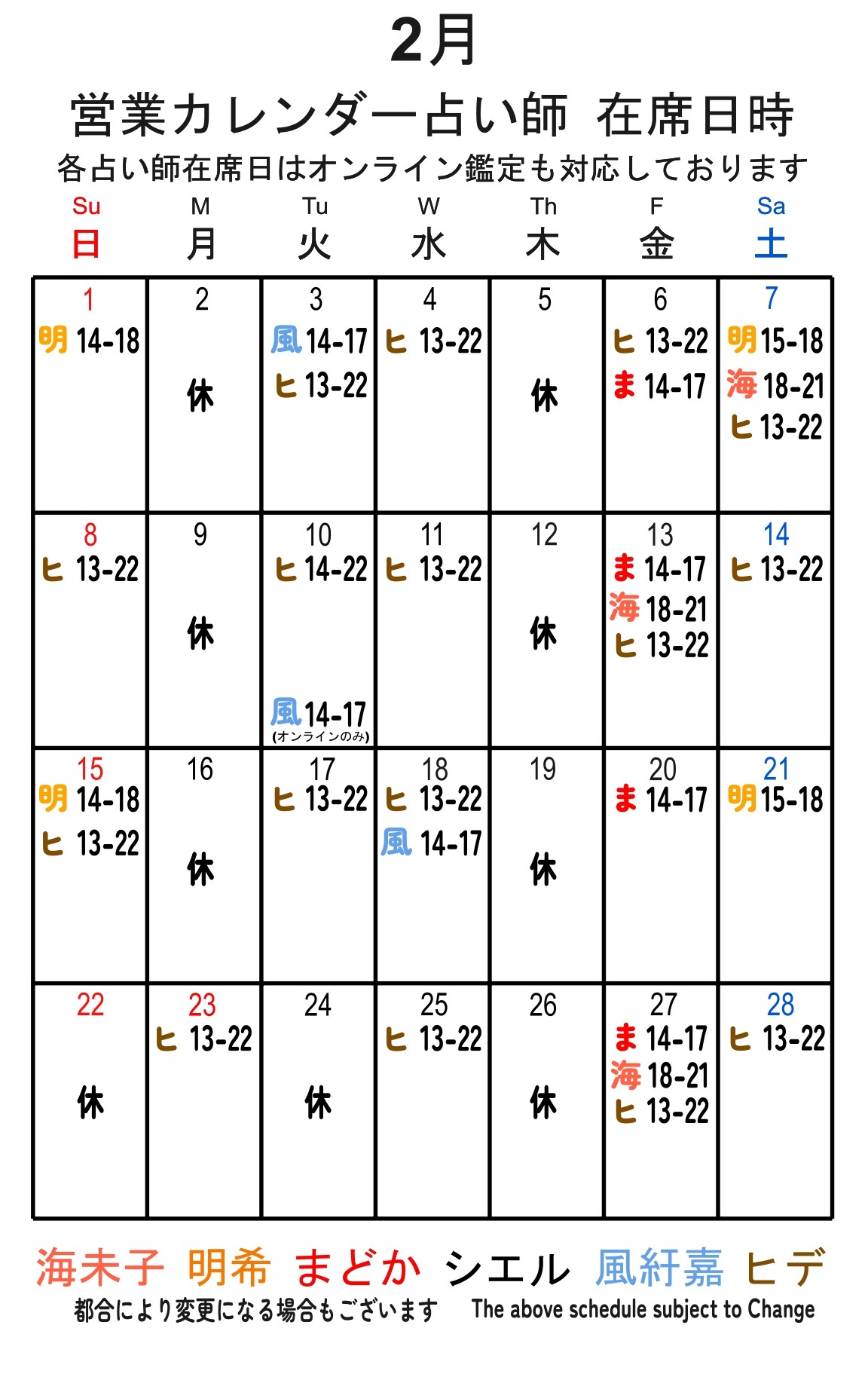 はそれぞれお一人づつ連続した枠をご予約ください。お連れ様どうしお互いの鑑定をお隣でお聞きいただく事もできます。2月占い師在席 選択する→タップorクリックで拡大全ての占い師は店舗在席日にはオンライン鑑定も受け付けております。
