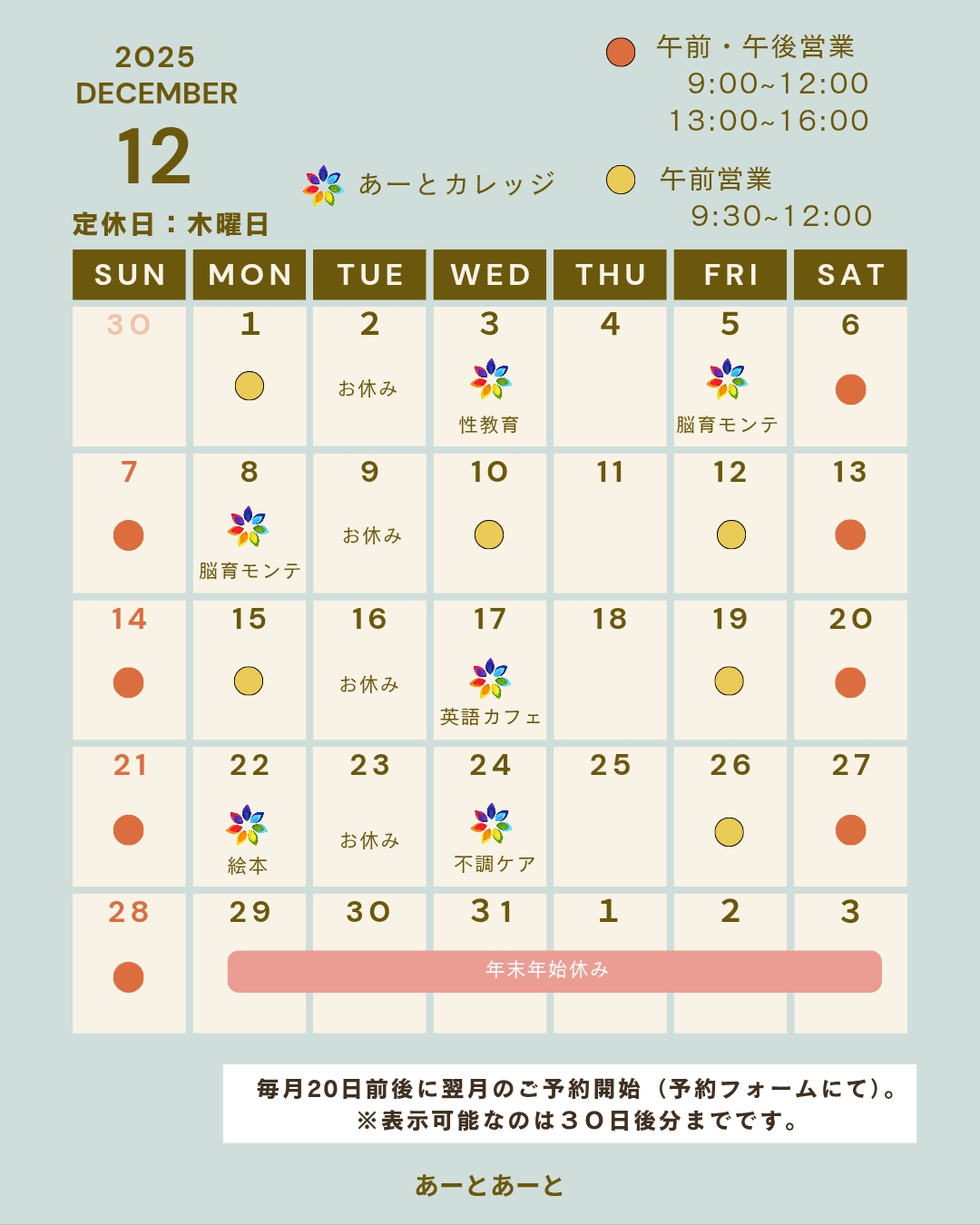 ⑤ 毎月20日前後にインスタにて『営業日のお知らせ(スケジュール)』と『予約フォームにて翌月の予約を開始』しています。予約フォームは『30日後分』までしか表示されません。