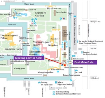 Nijo-jo Castle Tour Ticket Booth. Please enter through the East Main Gate and gather at the reception area next to the General Reception (on the left side after entering the East Main Gate). Please notify our staff at the reception of your presence.