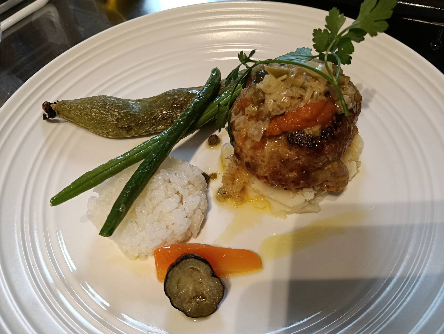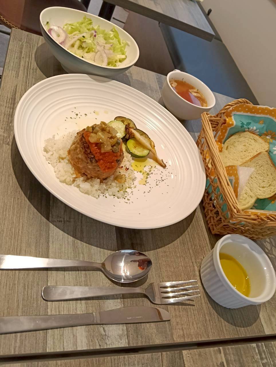 (サラダ、スープ、ハンバーグステーキ、焼き野菜、本日のパン、ドルチェ、珈琲または紅茶)