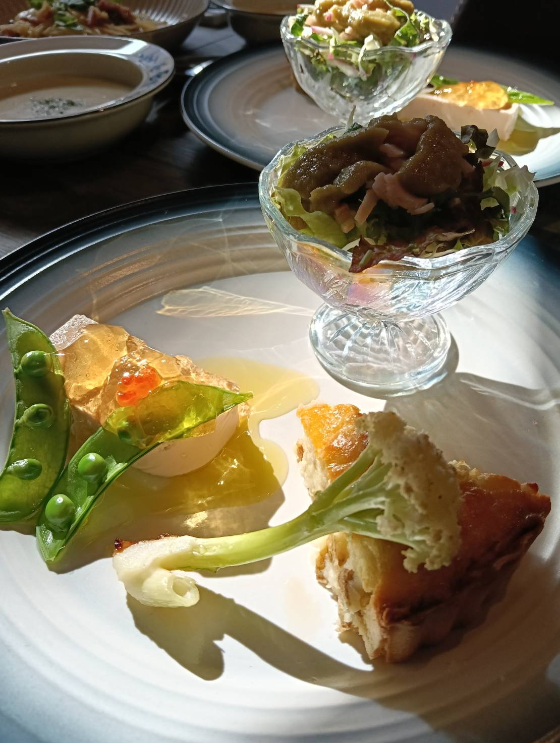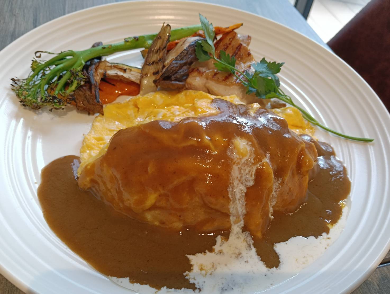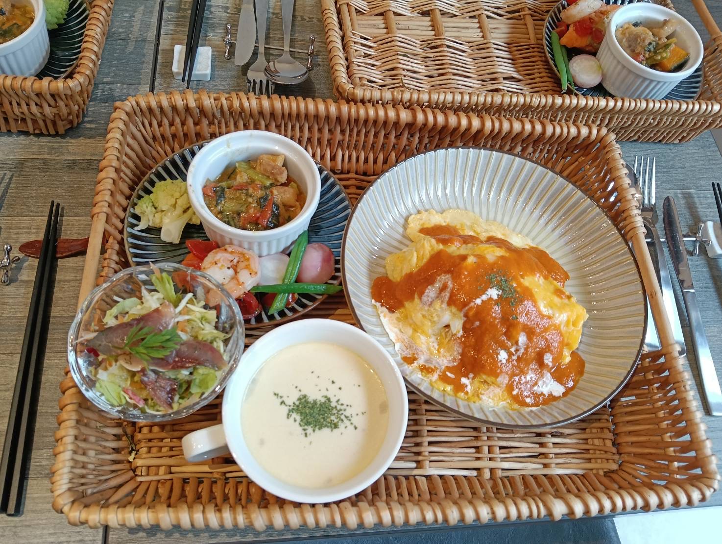 (サラダ、スープ、オムライス、焼き野菜、本日のパン、ドルチェ、珈琲または紅茶)