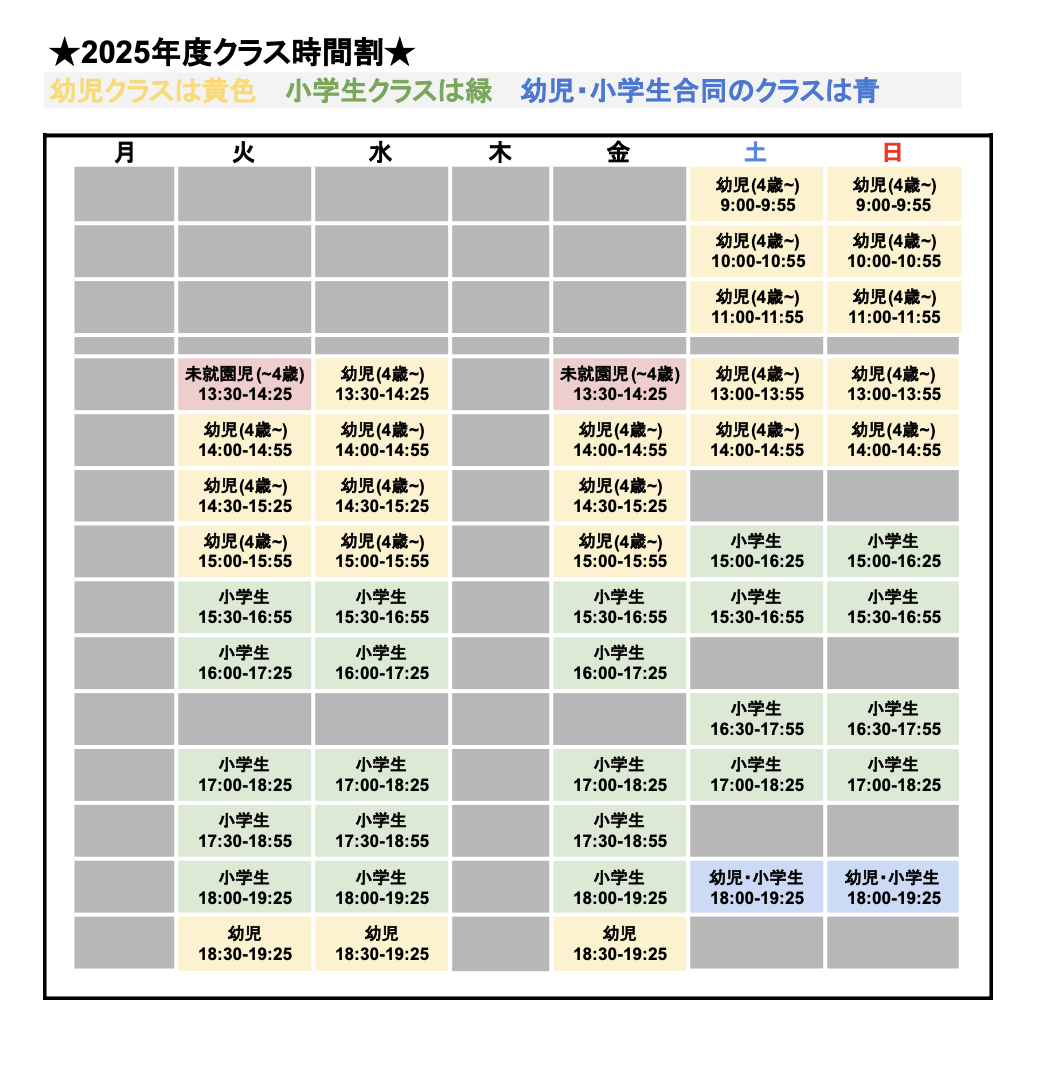 ・表記上30分単位での区切りとなっておりますが実際のクラス時間は以下の通りです。お迎え時間をお間違えないようご協力お願いいたします。