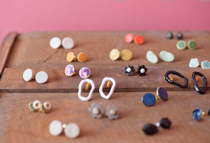 ピアスやイヤリングあるいはブローチを真っ白な粘土で思い思いの形につくったり、かわいい型を使い成形します。その後10色ほどの特別な絵具で着色します。※焼き上がりは5週間後。