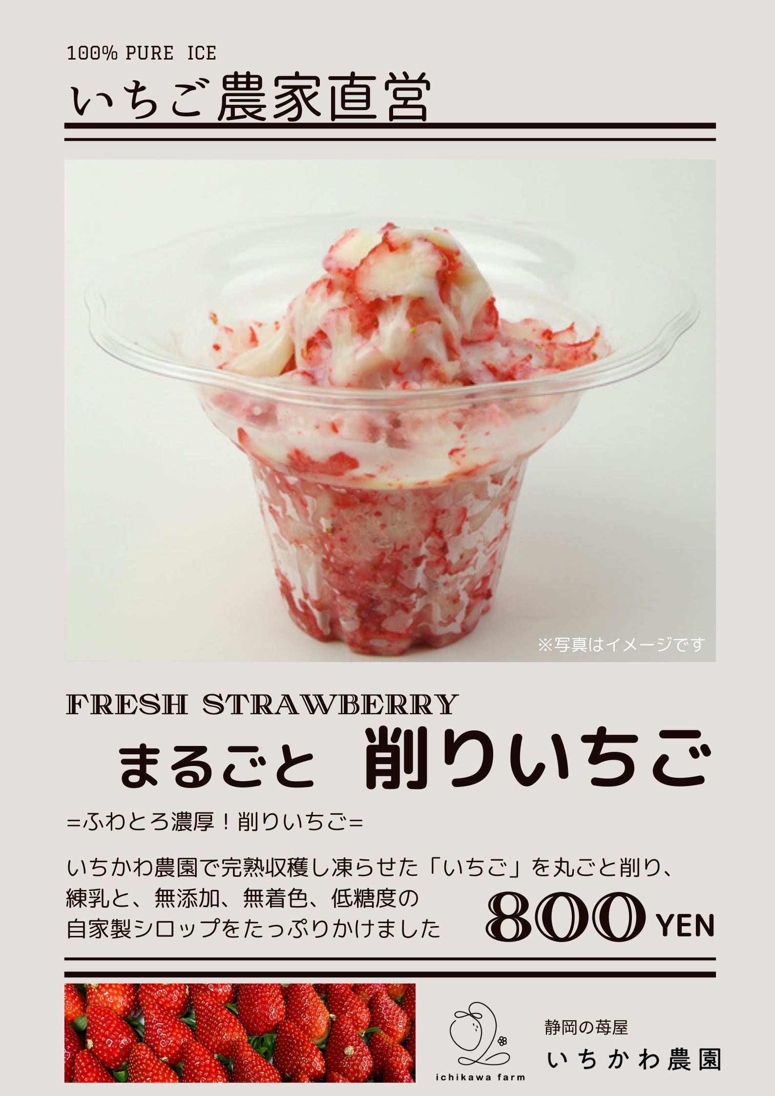=ふわとろ濃厚!削りいちご= いちかわ農園で完熟収穫し 凍らせた「いちご」を丸ごと削り、 練乳と、無添加、無着色、低糖度の 自家製シロップをたっぷりかけました
