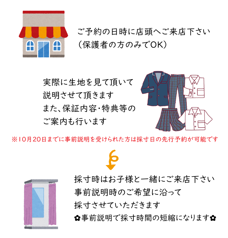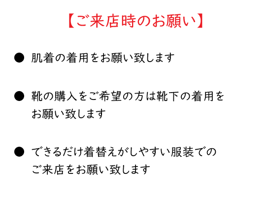①できる限り、採寸されるご本人さまと保護者の方1名でのご来店にご協力願います。