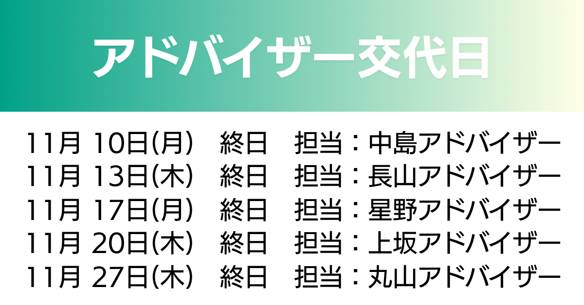 ①ご希望の日程をお選びください。 ※当日をご希望の場合はお電話にて空き状況をお問い合わせください。 ②必須項目を入力して仮予約を完了してください。 ③当センターから予約確定の連絡が届きましたら予約確定です。 《アドバイザー紹介はこちら》 月曜担当:丸山アドバイザー 火曜担当:中島アドバイザー 水曜担当:長山アドバイザー 木曜担当:荒木アドバイザー 金曜担当:星野チーフアドバイザー アドバイザーの担当曜日であっても、都合により代理のアドバイザーに交代となる場合があります。