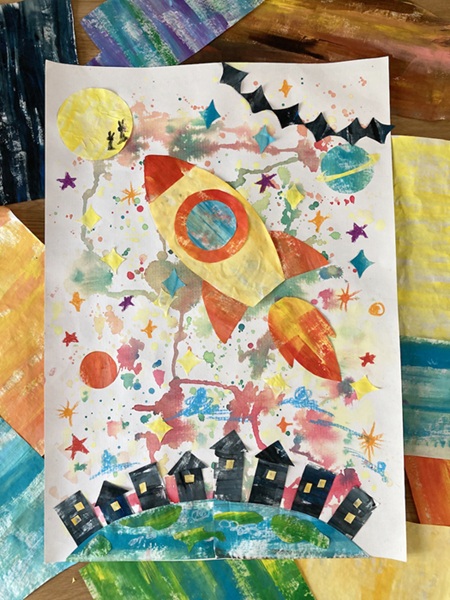 今回は「これを描きましょう」とお題はお伝えしません。そのかわりに、絵の具で鮮やかに彩られた紙を沢山ご用意します。