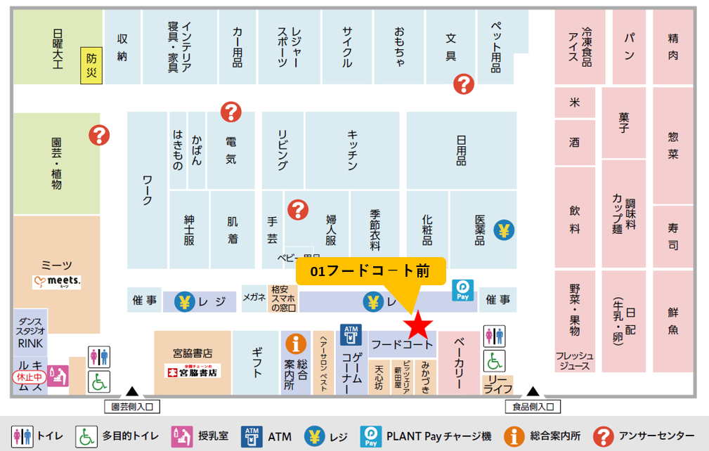 | 特徴 | ガチャから柱までの間が催事スペースとなります。後ろがフードコートのためお客様の迷惑にならぬようご配慮お願いします。催事用の備品の貸出を行っておりますので、フードコート内の机や椅子は使用しないでください。 |