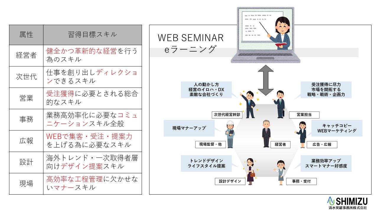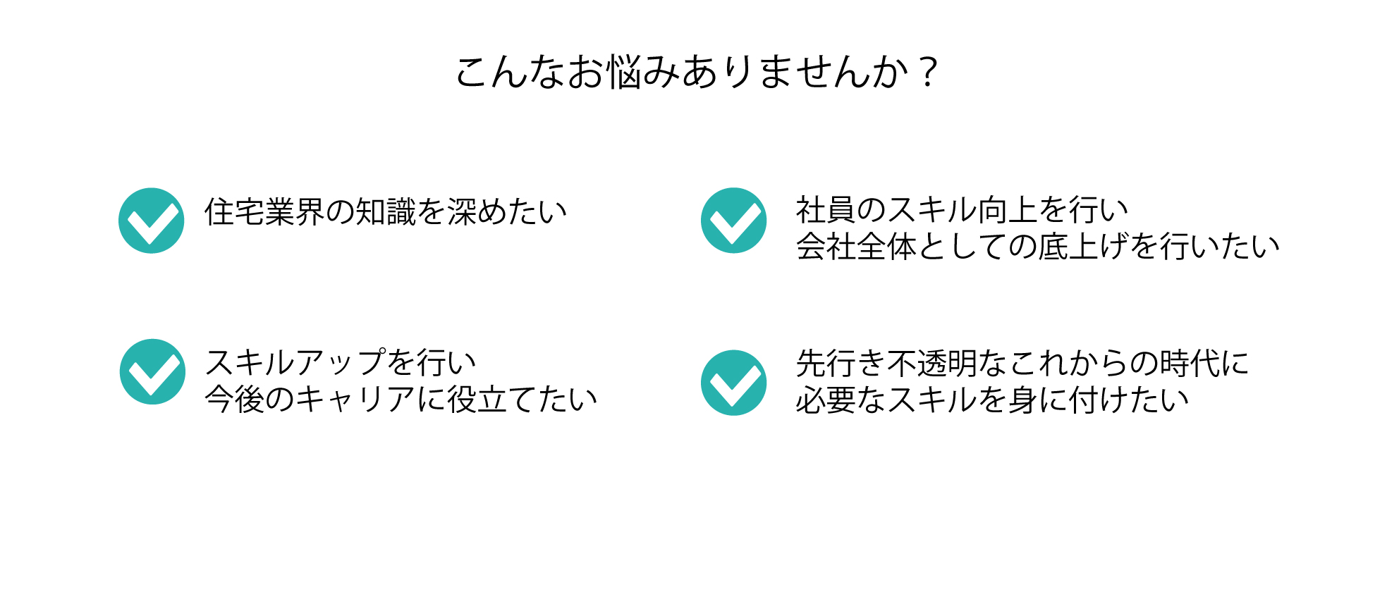 経営者・次世代幹部・営業マン・広告広報担当・設計者・現場監督、もしくはそれ以外の業務内容の方でも参考になる講座です。ご自身の現状のスキルをアップする為に講座を受けるケースもあれば、次期幹部候補を目指す為に、先に勉強を始めることも可能です。これからの時代を優位に過ごす為に必要なスキルを習得しましょう。