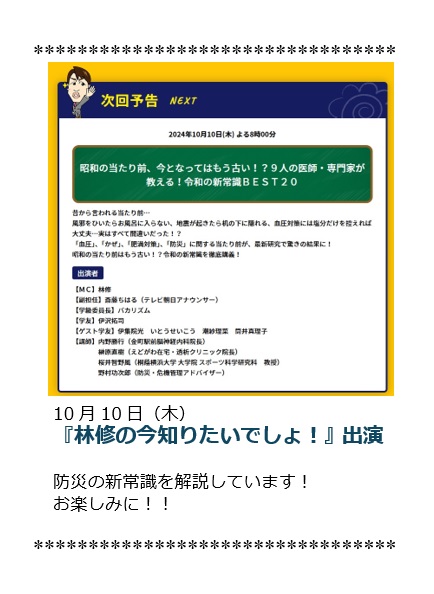 日本テレビ「世界一受けたい授業」の防災スペシャリストの先生・「THE突破ファイル」の再現ドラマのスーパーバイザーでも有名な講師。消防士経験で得た、災害・救急・救助等の現場での技術、知識、災害史から、防災・危機管理のノウハウを独自のスタイルで分かりやすくアドバイスします。