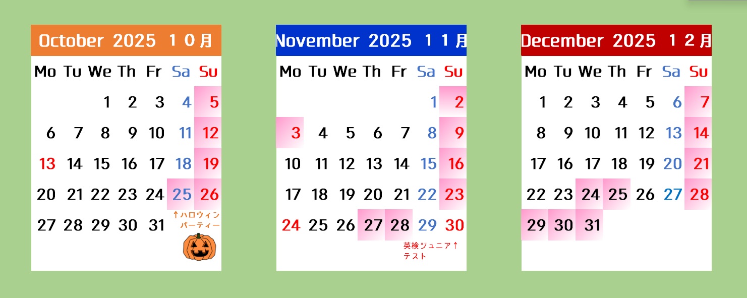 定休日の日曜とピンク色の日は通常レッスンがお休みです