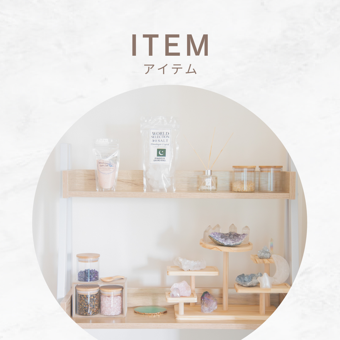 サロンでは、天然石のアイテムや浄化のアイテムの販売も行っています。セッションやネイル施術の合間に展示をお楽しみください。