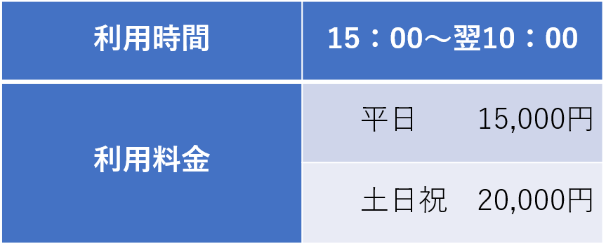 ※現在はOPEN期間中につき土日祝も15,000円でご利用いただけます。