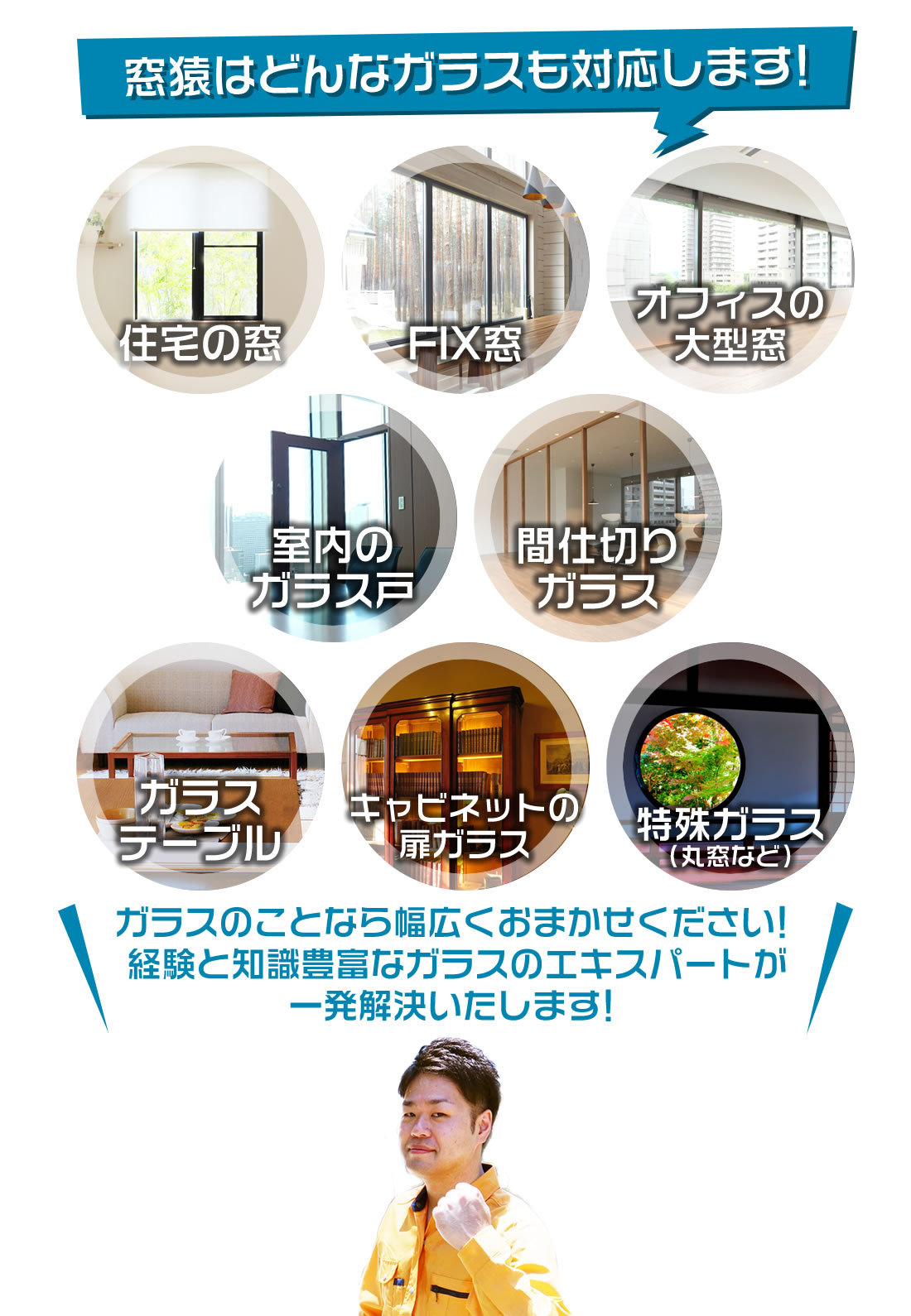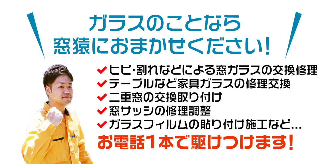 中川区で窓ガラスやドアガラス、サイドボードや食器棚やテーブルのガラス交換やガラス修理で、ガラス屋さんをお探しなら365日年中無休受付・最短即日施工・中川区エリア出張対応のガラス屋「窓猿」にお任せください。