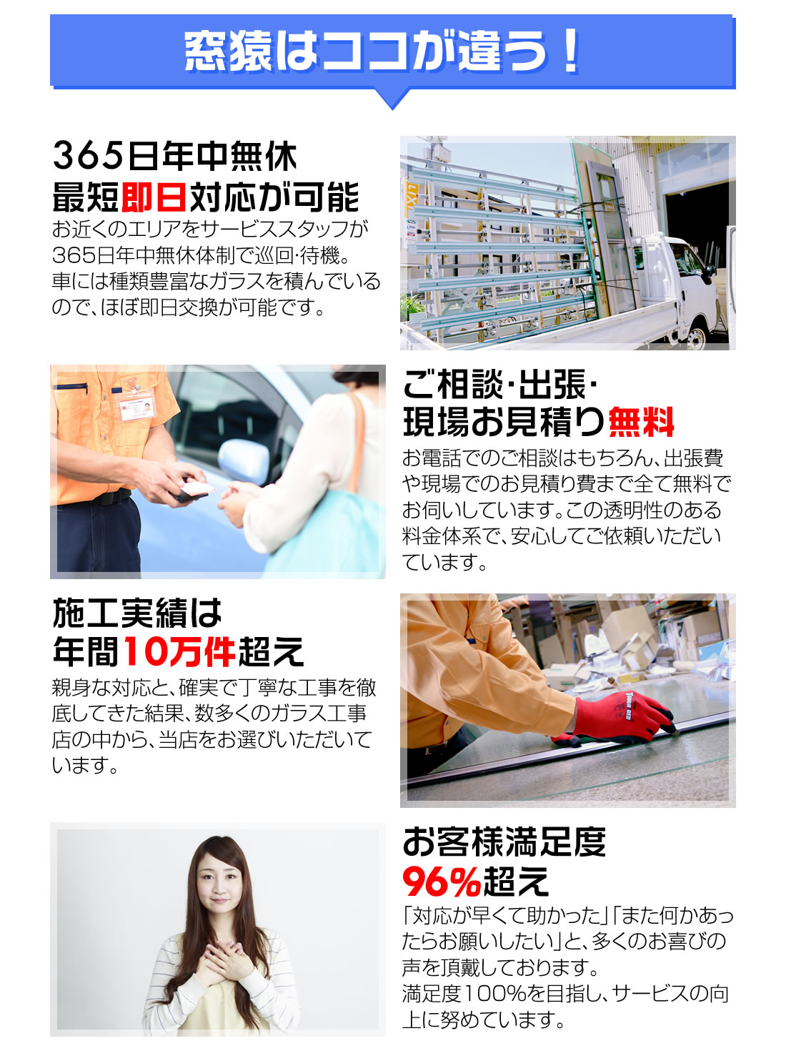 ベランダの掃き出し窓や部屋の引き違い窓や腰高窓、天窓や出窓や排煙窓、FIX窓(はめ殺し窓)やルーバー窓(ジャロジー窓)等、窓の種類を問わず対応しています。また、玄関ドアや勝手口扉や浴室ドアなどドアガラスや、玄関や室内の欄間ガラス、サイドボードやテレビ台のガラス扉や戸棚や食器棚のガラス引き戸やガラストップテーブルなど家具の硝子にも対応しています。