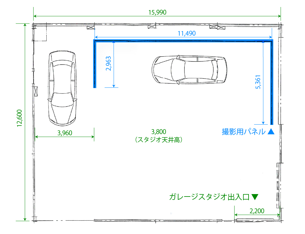 スタジオの入り口幅は220cmです。愛車のサイズをご確認ください。