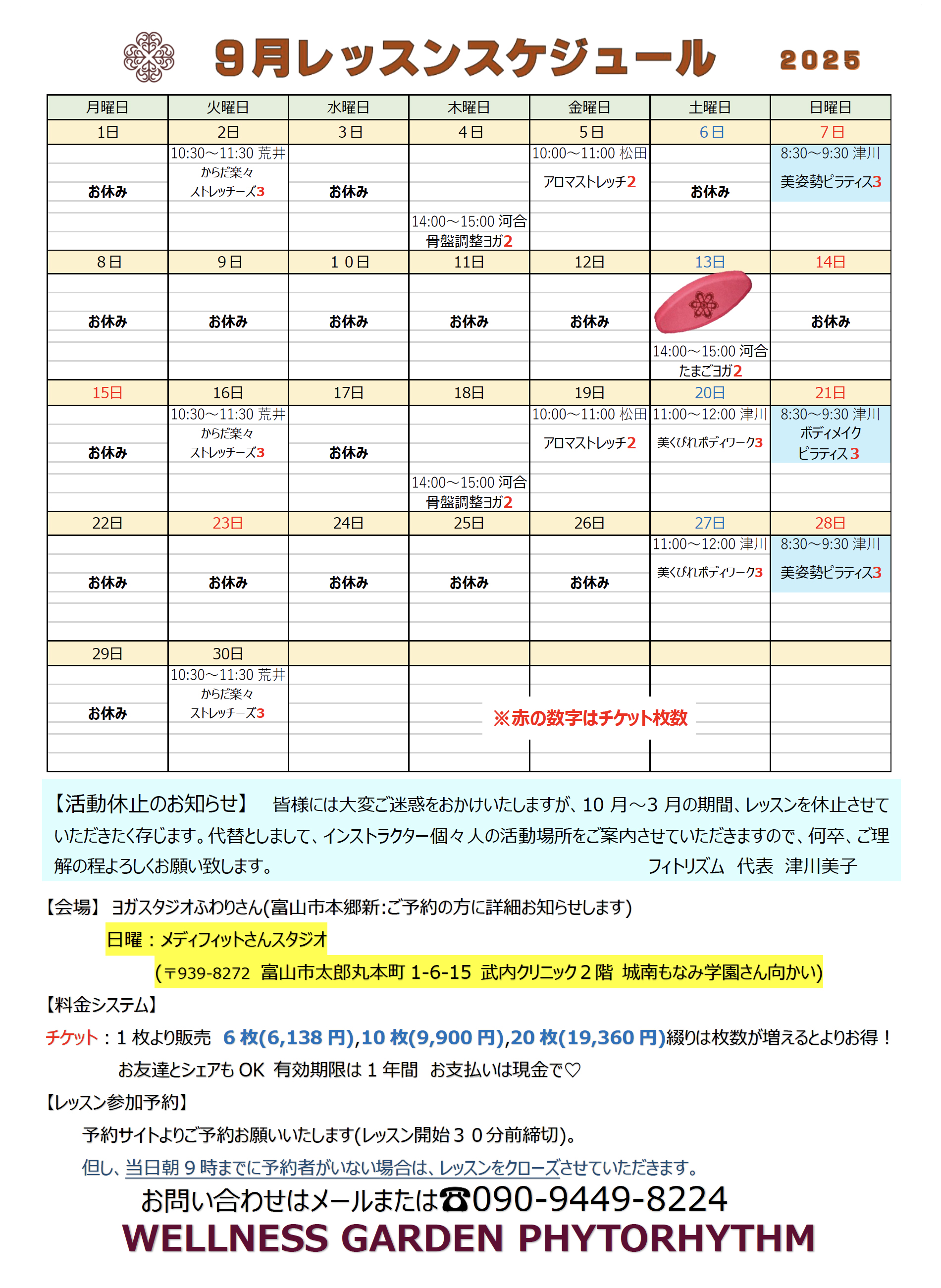 変わらずのご愛顧、よろしくお願いいたします。 日曜日は、メディフィットさんスタジオにて行います。 (富山市太郎丸本町1-6-15 2階 もなみ学園さん向かい) 営業時間は、レッスンスケジュール表をご覧ください。 15分前から入れます。