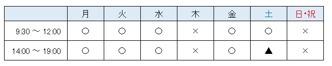 診療時間: 9:30~12:00、14:00~19:00 ▲: 土曜日は13:00~16:00まで 休診日: 木、日、祝祭日