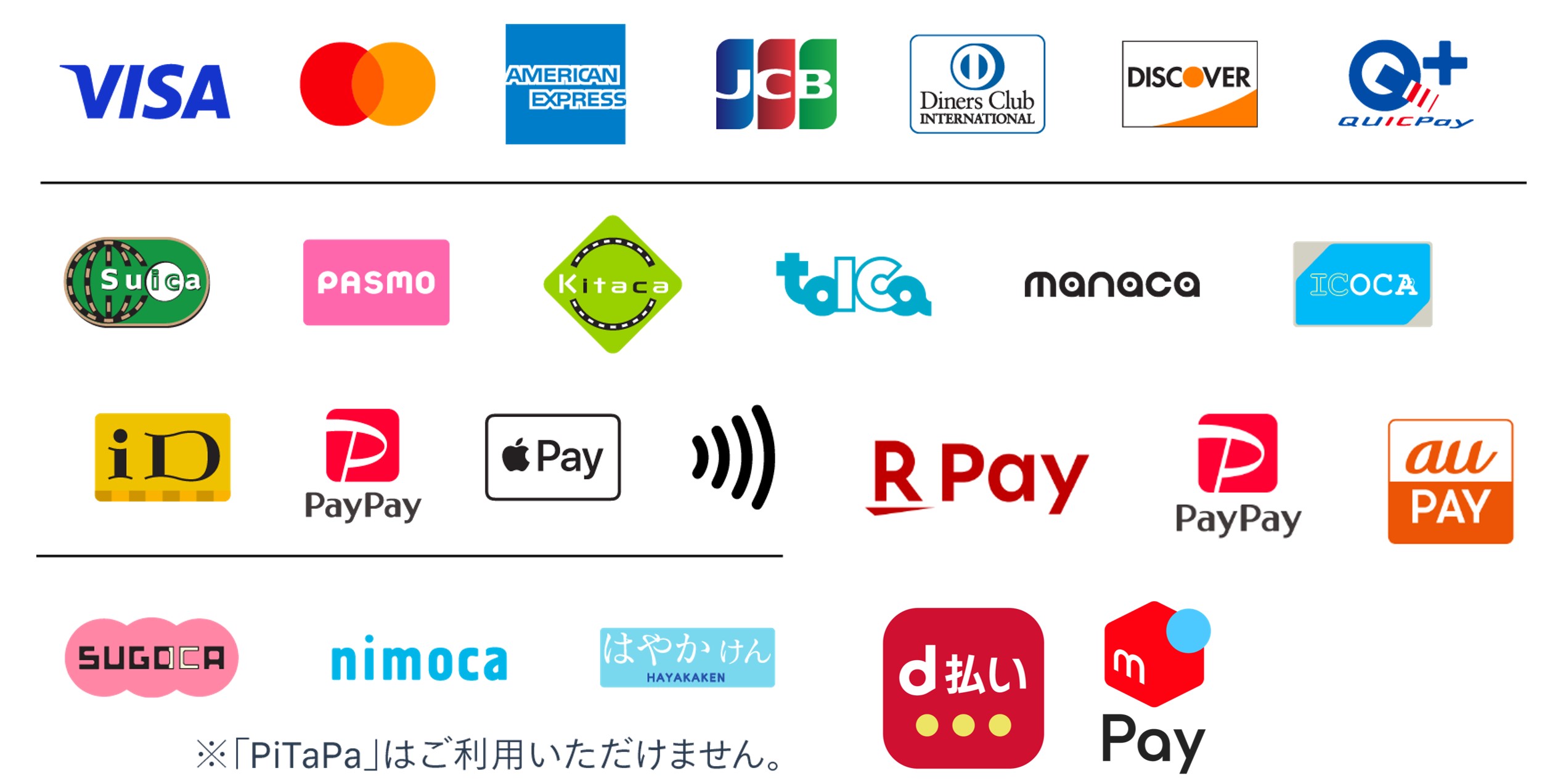 PayPay、楽天ペイ、d払い、メルペイ、au PAY、iD、QUICPay、Apple Pay、Suica、PASMO、Kitaca、