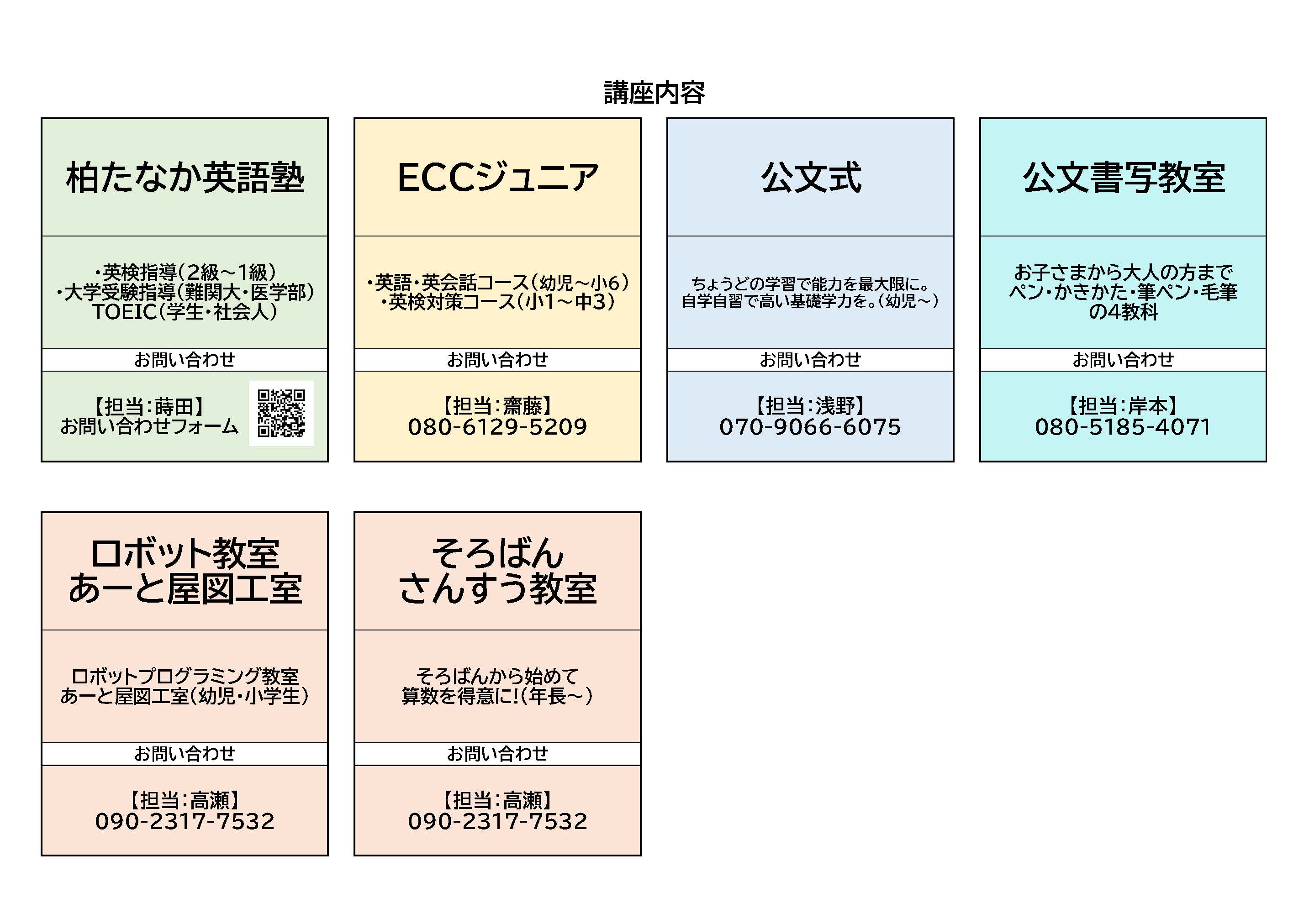 柏たなか英語塾・ロボット教室・さんすうそろばん教室・ECCジュニア・公文式・公文書写教室様にご利用いただいております。