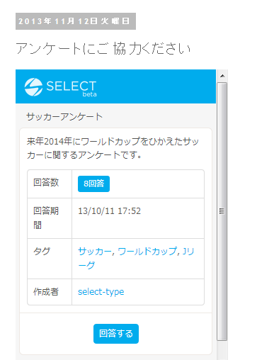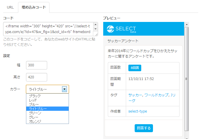 SelectTypeで作成したアンケートや診断テストはブログやホームページに埋め込むことが出来ます。