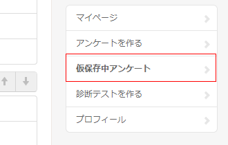 仮保存している診断テストの作成を再開するには、マイページサイドメニューにある「仮保存中診断テスト」をクリックします。