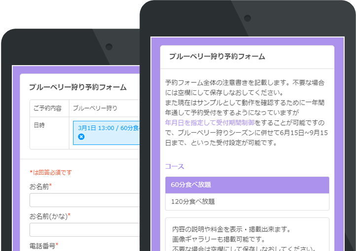 お客様がブルーペリー狩りのご予約空き状況を確認し、ご予約申込をするための予約カレンダー・予約フォームはスマートフォンアクセス時の表示最適化に対応しています。またお客様側だけでなく、管理者様用の管理画面もスマートフォン表示最適化に対応しています。管理者様もパソコンをいちいち立ち上げることなくスマホで簡単にご予約状況の確認やお申込みへの対応が可能です。