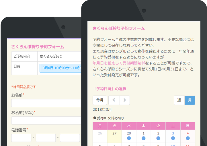 また行楽でさくらんぼ狩りツアーに訪れるご家族連れやお友達グループなど、ご予約担当者はほぼ日中お仕事を抱えていますから、合間・隙間時間で簡単にスマホ操作によるインターネット予約受付が出来ることは必須です。