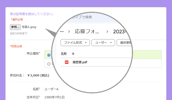 イベントの参加申込者様から、参加申込と同時にファイルの提出を受けることが出来ます。受領したファイルは連携したGoogleドライブに保管され、Googleドライブ上で直接あるいはSelectType管理画面のお申込み情報ページから参照出来るようになります。身分証の提示が必要なイベントなど、参加者様に資料提出を求めるイベント等でぜひご活用ください!