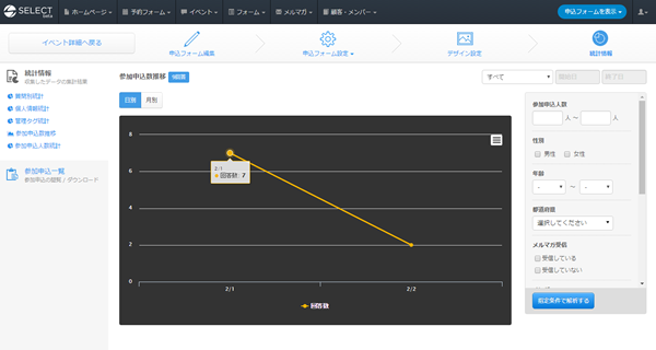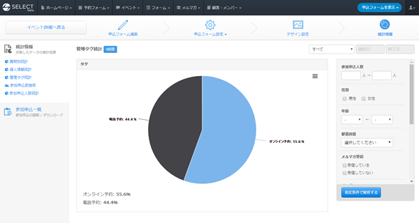 申込情報をもとに集計された統計情報が閲覧可能です。