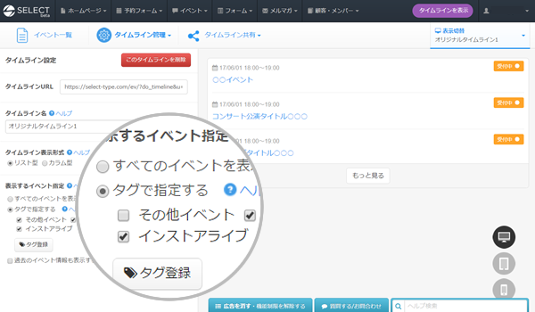 イベント管理システムで作成したライブやコンサートのイベント情報にタグを割り当てて管理することができますので、