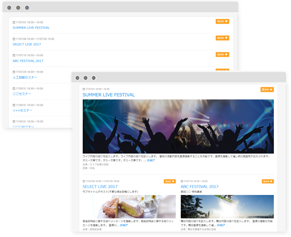 表示したイベント情報からイベント告知ページへ移動し、詳細情報とイベント参加申込が可能になります。ライブやコンサートのスケジュール情報をジャンルによって分けて表示したい場合などに便利です。