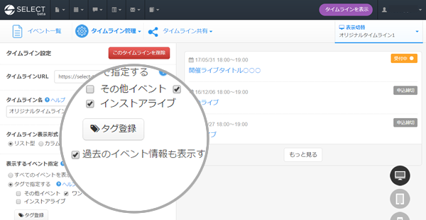 過去情報の表示切り替えは、イベント管理システムで作成されたタイムライン毎に指定できます。