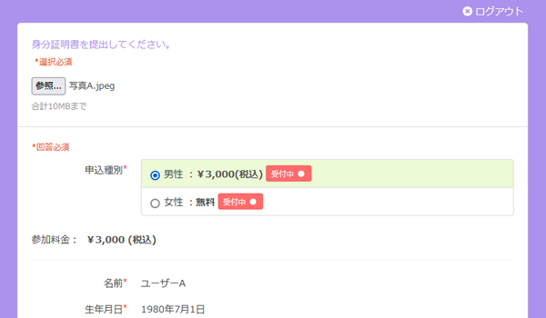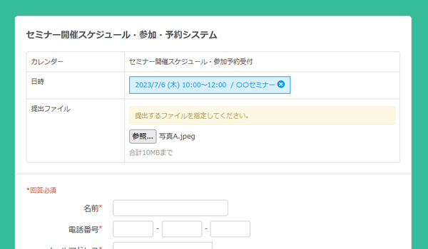 イベントの申し込み参加者から、参加申込受付時にファイル提出を求めます。