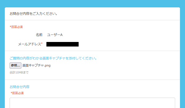 メールフォームの問い合わせ者から画面キャプチャなどの画像添付をいただくことが可能です。