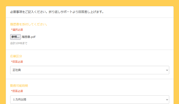 作成した求人応募フォームにて、お申込者からのファイル提出を受付けることが可能です。