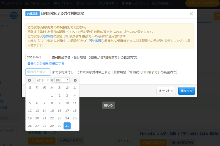 6月~10月までなど期間限定での予約受付が簡単設定で実現可能