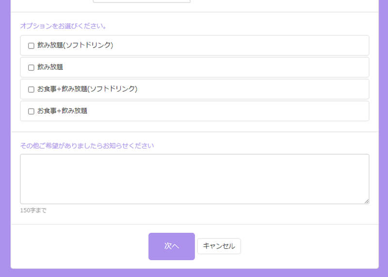 SelectTypeの予約システムは詳細な質問項目を作成して、予約受付時に必要情報をお客様から同時にヒアリングすることが可能です。質問機能は選択式からフリーワード入力まで多彩な形式に対応しています。事前にお食事メニューや楽器等の備品のリクエストを受付けたり、アンケートを収集したり、貴店のご希望に応じた幅広い用途でご活用いただけます。