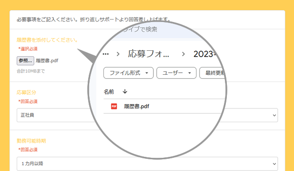 Googleドライブと連携して応募者からファイル提出を受付けることが可能です。フォームから提出されたファイル群はGoogleドライブにアップロードされます。またアップロードされたファイルのGoogleドライブ上のパス情報はSelectType側で管理され各応募情報から参照出来ます。履歴書・職務経歴書といった応募時に提出を求めたいファイル群の受取りにご活用ください!