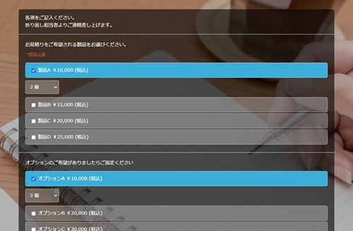 複数の商品・サービス選択肢を用意し、お客様の複雑な選択を組合わせて自動計算する自動お見積り機能をご提供しています。