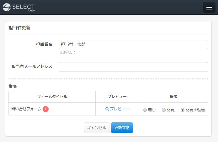 それぞれの問合せフォーム毎に担当者を設定することができ、フォームの用途ごとに担当者を割り振ることが可能です。また同じフォームでも担当者ごとに「閲覧のみ」「返信までできる」などの権限も設定することができます。