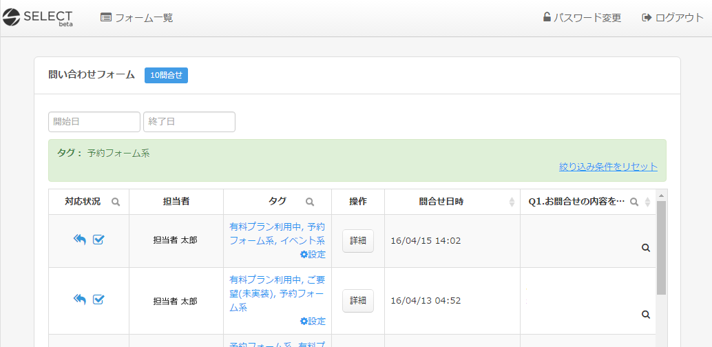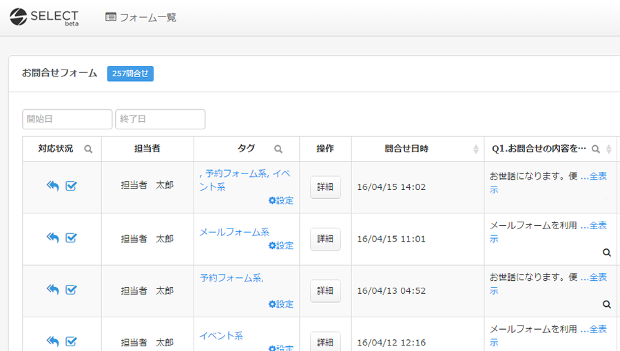 問い合わせの内容別集計、管理等の目的で、問い合わせ情報にタグを設定できます。「商品欠品」「ご要望」等、タグは自由に複数設定できます。