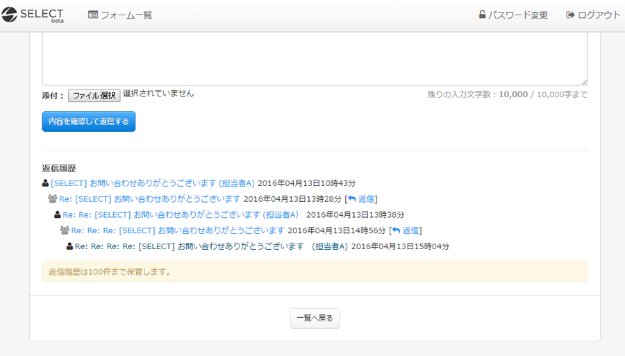 使い方はこちらSelectTypeのメールフォームでは、複数人が対応しても対応状況をリアルタイムに共有できます。対応中のメールに別の担当者が対応しようとするとメッセージが表示され、二重対応の心配もありません。