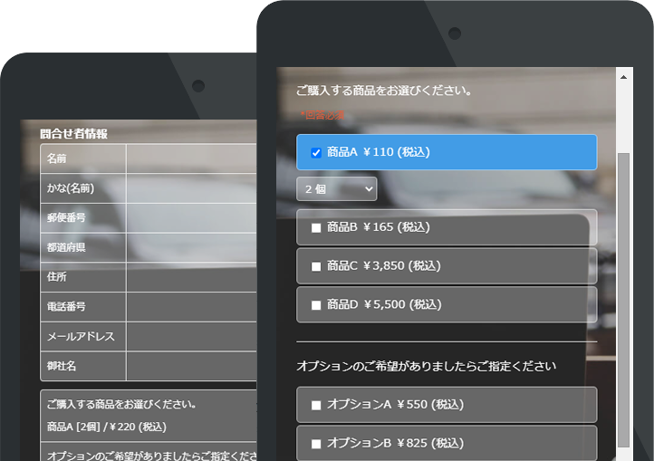 SelectTypeのメールフォーム機能で作成した注文フォーム/販売フォームはスマホ・タブレット、もちろんパソコンにも、様々なデバイスに対応しています。