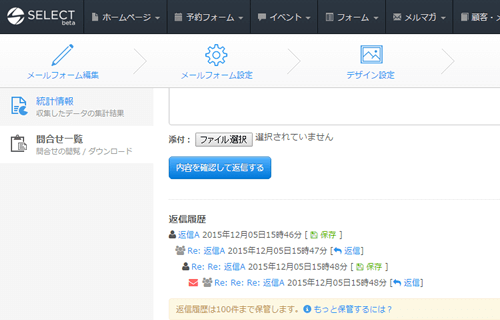 お客様の予約お申込みから、本予約までのメールのやりとりを、SelectTypeのメールフォームでは「返信履歴機能」が記録していきます。