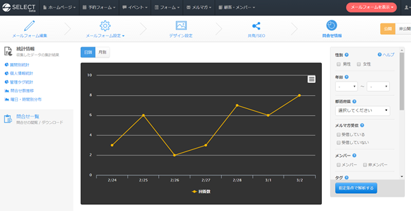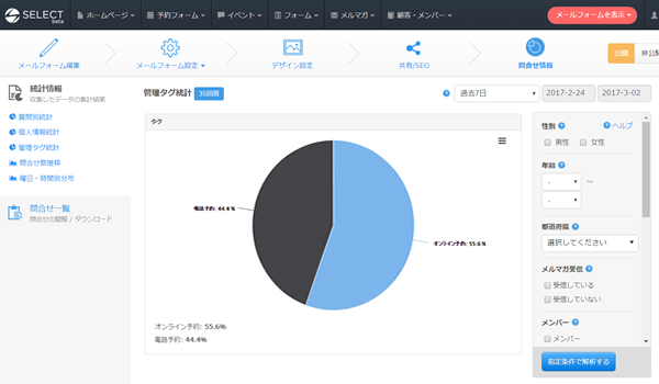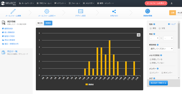 問合せ数推移、曜日・時間別の分布や個人情報統計など